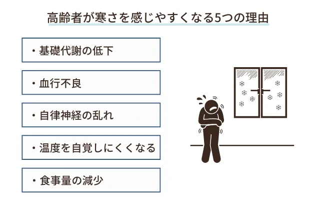 高齢になると、若いときよりも寒さを感じやすくなる理由は以下の5つです。