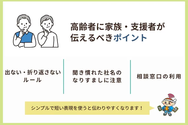 身近な高齢者が被害に巻き込まれないために、以下のポイントを伝えるのがおすすめです。